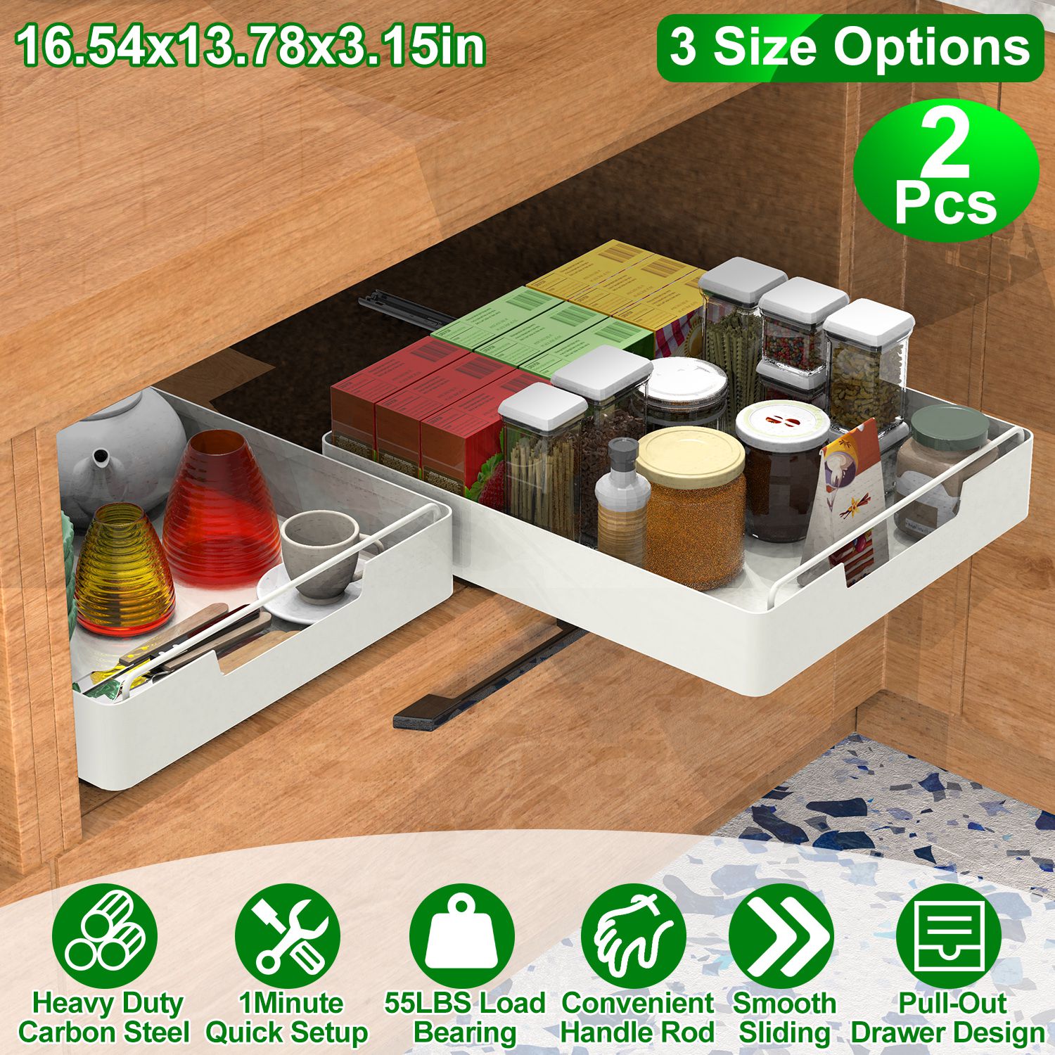 2Pcs Pull Out Cabinet Organizers Sliding Shelf Spice Rack Carbon Steel Roll Out Drawers Fixed with Adhesive Nano Film with Handle 55LBS Max Load