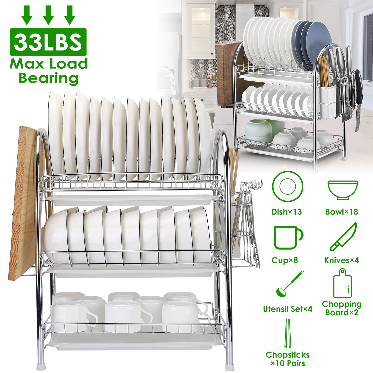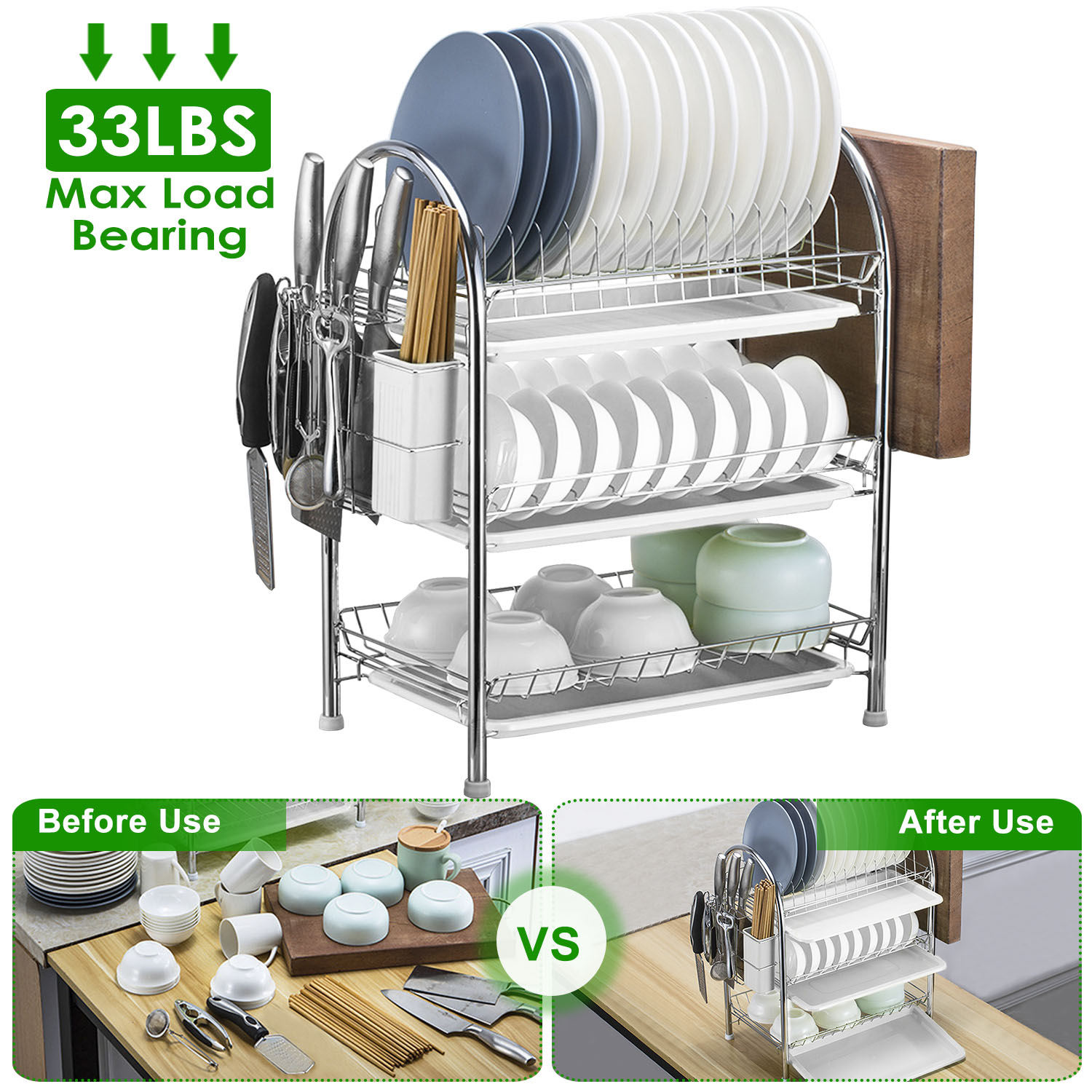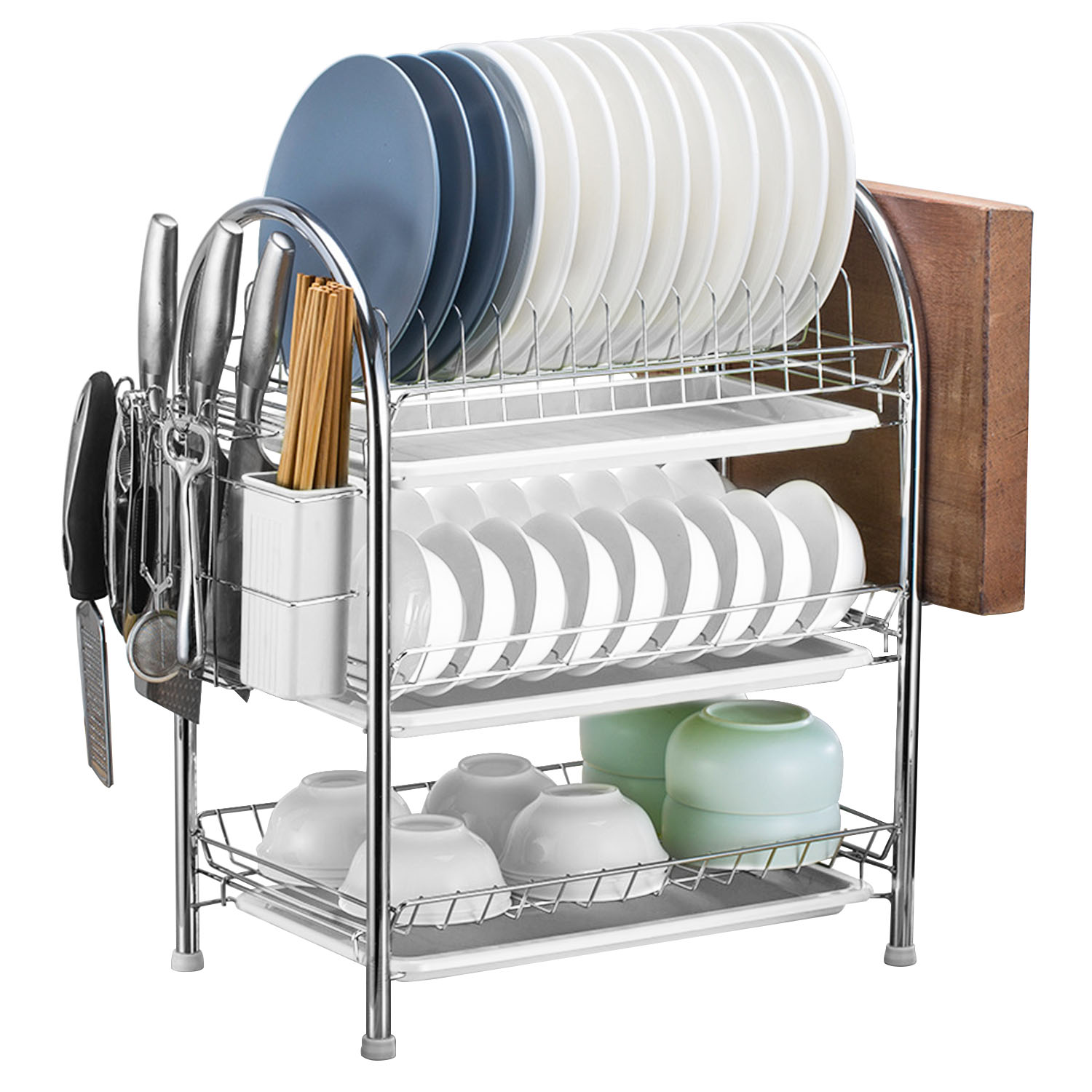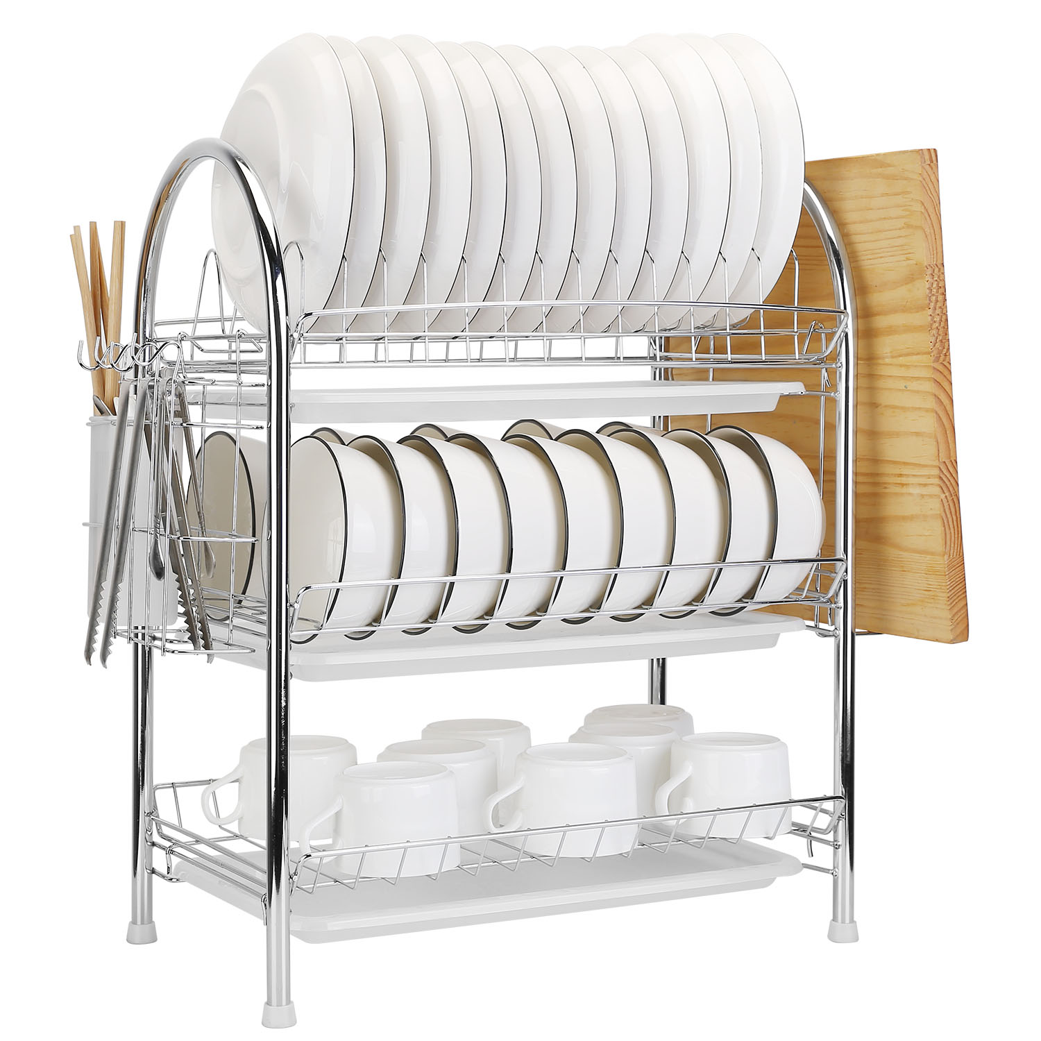 Home > 3-Tier Dish Drying Rack Dish Drainer Shelf w/ 3 Drain Trays Chopping Board Rack Utensil Rack Chopsticks Holder For Kitchen Counter Storage